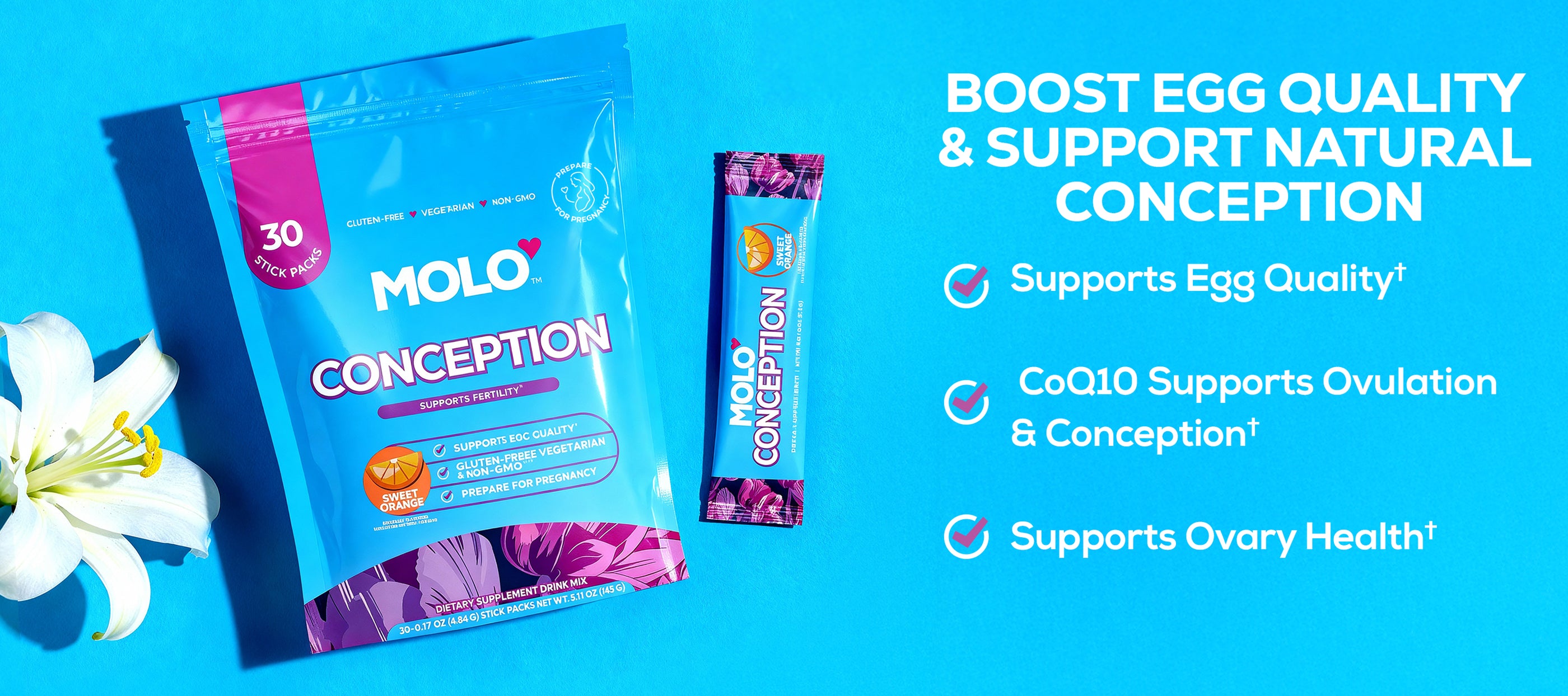 Vegetarian, gluten-free, and non-GMO. MOLO is made for women who want a safe, natural solution for hormonal balance. No bulky pills, just easy-to-take powdered drink mix with a delicious sweet orange flavor.
