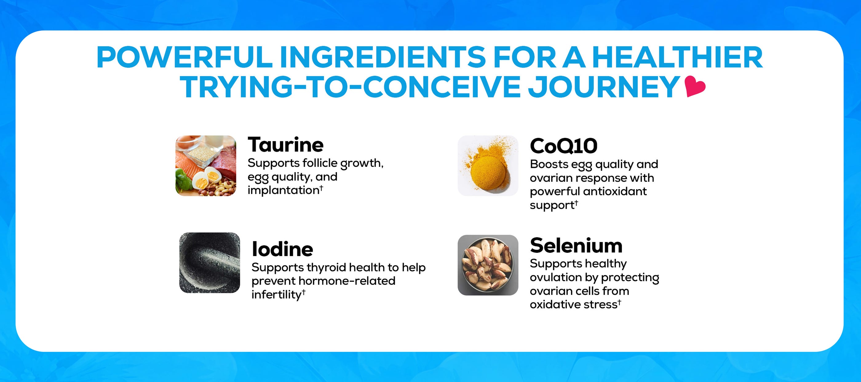 Conception is research-supported with CoQ10, Taurine, Selenium, Iodine, and Acai Berry to support egg health, ovarian response, and a healthy response to oxidative stress. Supports natural conception. Individual, pre-measured doses in a powdered drink mix format. Easy to take and delicious to drink!